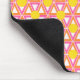Dieses Mauspad hat ein geometrisches Design, in dem sich rosa und orangefarbene Dreiecke wiederholen, mit gelben Kreisen oben auf einem weißlichen Feld. Das gleiche Design in verschiedenen Farben gewollt? Nachricht.