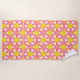 Dieses Strandtuch hat ein geometrisches Design, in dem sich rosa und orangefarbene Dreiecke wiederholen, die mit gelben Kreisen oben auf einem weißlichen Feld angeordnet sind. Das gleiche Design in verschiedenen Farben gewollt? Nachricht.