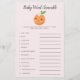 Niedliche kleine Süsse Thema Baby Dusche Baby Wort Rührei Karte mit der Abbildung einer Orange mit weißer Blume. Die Wortliste auf dieser Karte bezieht sich alle auf Babys und sie werden verdreht. Die Gäste werden konkurrieren, die sie alle zuerst auspressen können! ANTASTATUR: 1. Kindersitz 2. Milch 3. Laufgitter 4. Schnuller 5. Diaper 6. Schaukelstuhl 7. Kinderzimmer 8. Babymonitor 9. Sattel 10. Formel 11. Gummiklemme 12. Rolle.