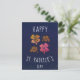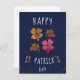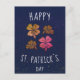 Pink Lucky Kleeblatt Clover Happy St. Patrick`s Day Postcard. St. Patricks Tageskarte. Vier Kleeblätter auf marineblau Hintergrund. Clovers mit vier Blätter für das Glück.