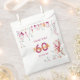 Eine Liebestasche für eine mädchenhafte 60. Geburtstagsfeier. Zweige mit rosa, lila und goldenen magnolischen Blume. Eleganter weißer Hintergrund. Der Text: Danke! In Rosa. Vorlagen für einen Namen, 60 Jahre und ein Datum. Geburtsdatum oder das Datum des Party/Jahrestages. goldfarbene und rosa Buchstaben. Der Name ist mit einem modernen handgeschriebenen Stilskript geschrieben.