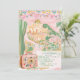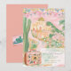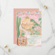 This destination wedding Save the date features painted artwork of a Mexican town scene with papel picado banners on top. All the important wedding details can be personalized. Colors include green, pink, blue, white and coral.