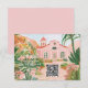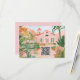 This destination wedding response card features painted artwork of a Mexican mission surrounded by tropical flowers with a QR code. All the important wedding details can be personalized. Colors include green, pink, white and coral.