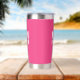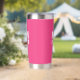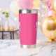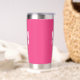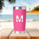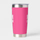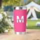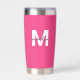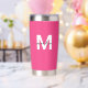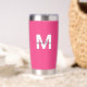 Create Your Own Stylish Modern Custom Magenta Hot Pink Name Monogram Travel Mug. This cute and chic travel mug features a bold magenta hot pink background with a crisp white initial on both sides, paired with your name in smooth black script for a clean, personalized touch you can see from any angle. The bright pink color gives it a fun, modern vibe while still keeping things simple and classy. Perfect for coffee or tea on the go, whether you're commuting, heading to class, or traveling. All colors can be customized to match your style. It makes a sweet gift for moms, sorority sisters, best friends, or anyone who loves a pop of color with their morning drink.
