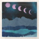 Diese wunderschöne abstrakte Landschaft zeigt eine nächtliche Bergszene mit einem kühnen rosa Mond, der in Phasen über dem Himmel gezeigt wird. Das Design ist in Blau, Zyan, Rosa und Grautönen gehalten.