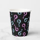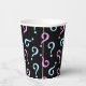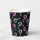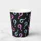 Ein Muster von rosa und blauen Fragezeichen auf schwarzem Hintergrund für ein Babygeschlecht offenbart Party. Hier auf einer Party-Tasse aus Papier gezeigt. Ändern Sie einfach die Größe des Musters, die Hintergrundfarbe und fügen Sie Ihren eigenen Text hinzu, wenn Sie möchten. Macht Spaß für jede Mutter!