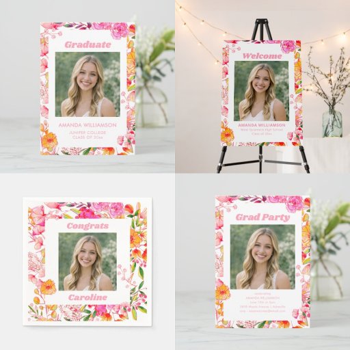 Pink Orange Floral Graduation Party Photo 2026 Einladung
