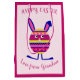 Diese lustige Ostergeschenktüte ist vollständig anpassbar, einfach in die Kisten, um den Gruß und den Namen oder anderen Text zu ändern. Der Standardwert in Deep-Rosa-Skript ist "GLÜCKLICH EASTER" und "Liebe von Oma". Der Hintergrund ist blassrosa, und der hellgelbe Ostereig geformte Hase weist Streifen und Muster in Rosa, Blau und Gelb auf.
