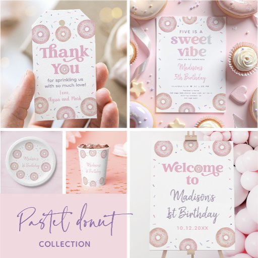 Feiern Sie Ihren kleinen Geburtstag auf die süßeste Weise! Dieses charmante Donut Geburtstagsdesign besticht durch meine handbemalten Aquarellbilder mit pastellrosa mattierten Donuts und bunten Sprinklen.