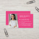 This modern business card now features bold hot pink backgrounds on both sides, paired with crisp white serif typography for a bright, stylish look. The vibrant pink tone gives the card a confident, eye-catching feel that works well for a wide range of professional styles. The front includes your photo, name, title or business name, and contact details in a polished, easy-to-read layout. The back includes a scannable QR code and simple social media icons with the phrase "Connect with us!" to help clients reach you quickly.