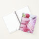 Spiral Notizbuch mit einem köstlichen Foto mit einem Turm von rosa Makaronen mit Himbeeren platziert. Wunderbar göttlich.