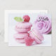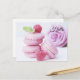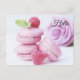 Eine Postkarte mit einem köstlichen Foto mit einem Turm aus rosa Macarons mit Himbeeren, die um ihn herum aufgestellt wurden. Wunderbar göttlich.