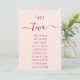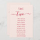 In the upper part, there is the table number written in a handwriting script and the word Table above, in smaller caps (hand letters). Under them, there are the 10 guest names, in similar hand letters. All text is red, the background is blush pink.