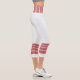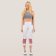 Two-tone design with retro style stripes on the lower legs. Horizontal lines in fuzzy wuzzy pink on a white background for your sporty Capri leggings. Add a personal touch to your outfit with your name on the left side of these high-waisted athleisure leggings.