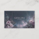Define your brand with the mystical beauty and ethereal romance of a hidden celestial garden using this captivating business card. The background is a stunning, dark midnight blue sky, filled with tiny stars and a prominent, glowing celestial planet or moon casting a soft, otherworldly light. The foreground features an abundant border of vintage-style roses and wild foliage in a dreamy palette of pale blush pink, lavender, and deep mauve-purple. Subtle golden sparks are scattered throughout the scene, enhancing its magical aesthetic. A thin, elegant metallic gold rectangular frame sits centrally, elegantly highlighting the celestial landscape and providing a refined space for your key information. This artwork beautifully merges the quiet wonder of the cosmos with rich, intricate botanical detail, resulting in a unique and sophisticated brand statement. This business card is ideally suited for a spiritual advisor or astrologer offering unique, mystical services, a fine art photographer specializing in moody, ethereal scenes, or a boutique hotelier wanting to convey a mystical, tranquil setting. It would also perfectly suit a luxury event stylist specializing in twilight or fairy-tale themes, or an independent perfumer whose scents evoke celestial gardens and twilight.