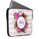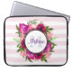 Personalisierter Laptop-Ärmel mit einem Namen und Monogramm Initial. Die Einrichtung besteht aus einem Blumenstrauß, das aus hellrosa Rose und dunkelrosa Pappeln mit vielen grünen Blätter besteht. Ein überlagerter Rahmen, der den personalisierten Text hineinlegt. Der Hintergrund ist ein weiches pastellrosa gestreiftes Muster.