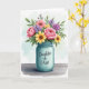 Designed with an overflowing bouquet in a teal glass jar, this illustration sets a tender, affectionate tone like a gift left for someone special ❤️. The jar sits centered on a lightly textured, rustic wooden surface, grounding the scene with a cozy, homey feel. Above it, lush pink roses open in soft layers, their petals leaning into one another as if sharing a quiet moment. Sunny yellow, daisy-like flowers cluster nearby, adding cheerful warmth that feels like a friendly smile across the table 🌼. Small purple, hyacinth-like blooms and scattered pale pink petals weave between the larger flowers, creating gentle movement among deep green leaves. The background is a light watercolor wash of pale blue and green that keeps everything airy while the bouquet stays the focus. A short message appears on the jar, placed on the front in small, light-colored lettering that contrasts against the cool teal glass, with the flowers filling the upper half of the card. The glass catches soft, diffused highlights along its curved rim and sides, and the weathered wood grain runs horizontally beneath it.