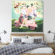Moderne Collage Wall Art. Dieser ist ein Vintager Retro-rosa Roller mit den Fahrerbeinen gezeigt und mit einem Strauß von Blume gegen einen dramatischen wolkigen Himmel mit Schmetterlingen auf grünem Gras. Farben aus blassem Pfirsich, pinken, gelb, lavender, blau und grün. Spaß, Mod und eklektische Ephemonie. Dies ist eine flache Oberfläche mit einer glatten Leinwand. Spaß, surreale Kunst mit einer Mischung aus Collage und digitaler Kunst, mit einem Vintagen Retro-Gefühl Mitte des Jahrhunderts.