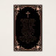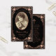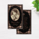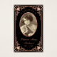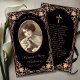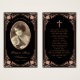 Eine Gedenkkarte mit Vintager Luft für eine Beerdigung. Auf beiden Seiten ist es schwarz und hat einen eleganten barocken Vintagen (Imitat) Rose Goldrahmen. Auf der Vorderseite befindet sich ein Vintages ovales Foto mit einer goldenen Rose und einem rosa Text darüber und darunter. Die Wörter "in liebevoller Erinnerung" sind über dem Foto gewölbt. Der Name ist in einem eleganten Kalligraphieskript unterschrieben. Auf der Rückseite ist ein Gebet, in rosa Kappen, mit einer Rose goldenes Kreuz darüber. Der Hintergrund mit seinen eleganten barocken goldenen Dekorationen auf blauem Lederband stammt aus einer Vintagen französischen Buchbinderei von Georges Mercier (1885-1939) - Madame de Maupin von Teophile Gautier, Band 1, Ausgabe 1911, Paris - jetzt im öffentlichen Bereich, von The New York Public Library. Das Platzhalter-Foto, ein altes Sepia-Portrait einer jungen Dame aus den frühen 1900er Jahren, wurde von Zoltan Matuska aus Pixabay kostenlos für kommerzielle Nutzung angeboten.
