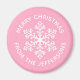 Eine weiße Schneeflocke auf pastellrosa Hintergrund mit "Frohe Weihnachten" aus der Familie um sie herum.