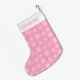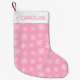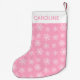 Ein Muster weißer Schneeflocken auf einem rosa Hintergrund. Die Oberseite des Strumpfs ist weiß mit einem individuelle Name in passendem Rosa.