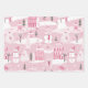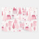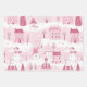 A collection of pretty, pink holiday wrapping paper sheets featuring a snow covered village dotted with adorable pink houses and trees.