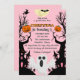 Machen Sie sich mit dieser lustigen Einladung zum Geburtstag auf eine lustige Feier gefasst! Dieses spielerische Design mit einem rosa Hintergrund mit Spuk Häusern, Gespenstern, Kürbissen, Fledermäusen und einer fliegenden Hexe ist perfekt für die Halloween-Geburtstagspartys der Kinder geeignet. Ideal für Geburtstage im Oktober, Party für Kostüme oder jede Spuk Hausfeier. Personalisieren Sie sich einfach mit dem Namen, dem Alter, dem Datum, der Uhrzeit und dem Ort Ihres Party. Eine feierliche Einladung, die den Ton für eine geistreiche Zeit Set, die Ihre Gäste nie vergessen werden!