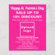 Pink Flyer für St. Patrick's Day, dass Sie anpassen können, indem Sie den Rabatt-Prozentsatz, Kaufdatum, Hochladen Ihres Firmenlogos, Geben Sie Ihren Geschäftsnamen, Adresse, Telefonnummer, E-Mail und Website. Passen Sie es an und vertreiben Sie es, um mehr Kunden zu gewinnen, Ihre Produkte oder Kunden zu kaufen, um Ihre Dienste zu mögen. Bitte Karo nach dem Hochladen von Logos und Schriftzeichen auf das Aussehen der Vorder- und Rückseite. Wenn Ihnen das Aussehen gefällt, können Sie jetzt Ihre Bestellung aufgeben. Wenn Sie das Logo und die Texte so verändern und verändern müssen, dass sie auf diesen Flyer oder auf die von Ihnen gewählte Schriftgröße passen, passen Sie bitte das Design-Tool an. Sie können auch die Hintergrundfarbe, die Farbe des Schriftartes und den Stil des Schriftartes im Designwerkzeug ändern. Alles Gute zum St. Patrick's Day! Wir wünschen Ihnen viel Glück, Freude und mehr Umsatz in diesem Urlaub.