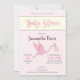 Elegantes und niedliches Baby Dusche Einladungs-Design. Mit rosa Metallfarbe Baby Shower Kalligraphie Drehbuch und einem rosa Metall Farbe Storch mit weißen Polka Punkte und einem sanften rosa Hintergrund. Personalisieren Sie den Text mit Ihren eigenen Daten oder klicken Sie auf Anpassen, um Ihre eigene Touch hinzuzufügen.