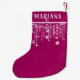 Rosa und weiße Saitenleuchten beleuchten Glitzern Weihnachten Strumpf mit einem niedlichen whimsical Spaß Lichter und Namen für eine festliche Urlaubssaison.