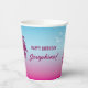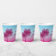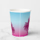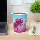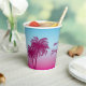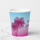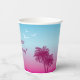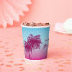 Serve drinks in dreamy tropical style with this pink-to-blue paper cup, designed by Destei. Two pink palm tree silhouettes rise against a pink-to-blue gradient sky, while three light blue birds fly above. Perfect for birthdays, beach parties and summer celebrations, these cups add a tropical touch to any gathering.