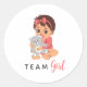 This playful “Team Girl” sticker features a baby in pink with a bow, pacifier, and cuddly stuffed bear. A cheerful design for gender reveal celebrations, party favors, or envelope seals. Text can be adjusted to match your theme.