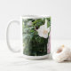Diese farbenfrohe Tasse ist mit einem Paar Budgerigars, einem Blau und einem Rosa ausgestattet und sitzt auf einem Ast vor den weißen Angel Trumpet-Blume. Ein wunderschönes Geschenk für einen Budgetinhaber.