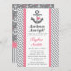 Feiern Sie die Ankunft eines neuen Babys mit dieser niedlich rosa und grauen Babydusche und Babydusche mit einem grauen Anker mit weißem Stern und rosa Herz, die an einem silbernen Seil und einer diagonal grauen und weißen Streifen-Grenze hängt, mit einem PRINTED Imitat geheftet rosa Band-Design auf beiden Seiten. Diese individuelle Babydusche-Einladung kann mit dem Mama personalisiert werden, um seinen Namen und Babydusche Details. Kunstwerk und Design © Chrissy H. Studios, LLC.Alle Rechte vorbehalten.