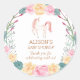 Pink Einicorn Blumengrün Kinderdusche Danke für den klassischen Rundaufkleber - Adorable und niedliche Aufkleber mit einem rosa Einhorn umgeben von gelben und rosa rosa Blume und grünem Blattwerk. Alle Texte sind so vorbereitet, dass Sie Ihre Daten schnell und einfach personalisieren können.