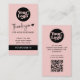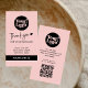 Pink Dankeschön bestellen QR-Code-Rabattkarte für den Einzelhandel" für Boutiquen, Online-Shops und Dienstleistungsunternehmen, die einen bleibenden Eindruck verlassen suchen, mit einem schwarzen Firmenlogo, einer herzlichen "Dankeschön für Ihren Einkauf"-Nachricht mit einem charmanten Herzdesign, exklusivem Rabattcode zur Belohnung loyaler Kunden, Ihren geschäftlichen Kontaktinformationen und einem skannabnehmbaren QR-Code für Kunden auf Ihre Website, soziale Medien, soziale Medien, oder spezielle Angebote auf sauberem und modernem, rot-rosa Hintergrund für eine minimalistische Ästhetik. Bitte kontaktieren Sie den Händler, um bei Bedarf weitere Anpassungen vorzunehmen.