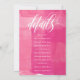 Trendy Bachelorette Weekend Einladung mit Bachelorette Weekend geschrieben in einem herrlichen Wirblen Drehbuch vor einem weißen Hintergrund mit rosa Wasserfarbenküssen. Fügen Sie Ihre Reiseroute oder Details auf den Rücken in weißem Text vor einem tiefrosa Aquarellhintergrund.
