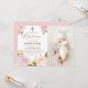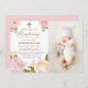 Weiß und elegant florale Taufeinladung mit handgezeichnet Aquarell-Illustrationen von rosafarbenen Bauern und Rose mit Polka Dots Muster zurück. Dieses Foto lädt zum Taufen ein. Diese Blumeneinladung ist auch ideal für Frühlings- und Gartenaufführungen.