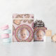 Dieses Foto Wrapping Paper enthält handgezeichnet Baby-Illustrationen von Nathalie Portet mit Babymotiven von Bonbons, Herz, Rattles, Flaschen auf einem rot-rosa Hintergrund. Personalisieren Sie sich mit einem Foto Ihres Babys in die charmanten runden Lebkuchen.