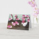 Farbenfrohe Karte mit einem Foto, das aus fliegenden rosa und weißen Tulip-Petalen über einem TableTop besteht. Original Fotografie von Lianne K. Coleman
