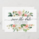 Moderne Kalligraphie-Skripte. Elegante Aquarellfarbe Rosa Rosa Blütengrün Hochzeit Sichern Die Date Card beinhaltet rosa weiße Rosen und andere schöne grüne.