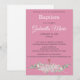 Celebrate your child’s special day with this elegant white rose and soft pink blooms watercolor baptism invitation. White flowers rest atop delicate green ombre foliage, with a hand-painted brown cross above the flowers on a pink background, creating a serene and graceful design.