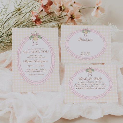 Invite your friends and loved ones to your spring/summer baby shower with our lovely pink and yellow lemon-themed baby shower design.