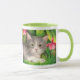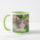 Ein kleines graues und weißes Kätzchen versteckt sich unter einigen pinkfarbenen Blumen. Grafik durch Carmen Medlin.