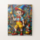 Pinocchio, mit einem gelben Hut, blauer Bogen-Krawatte und roten Hosenträger. Hinter Pinocchio befindet sich ein faszinierendes Buntglasfenster mit Schlossdesigns. . Im Vordergrund stehen lebendige rote Blume.