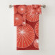 Dieses Handtuchhandtuch-Set hat ein modernes Design von roten Kreisen mit weißen Sternexplosionen in ihnen, alle auf einem Ziegelfeld.