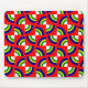 Dieses Mauspad hat ein Bauhaus-Design aus Viertelkreisen in blau, gelb, grün und weiß auf einem roten Feld.