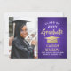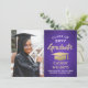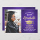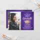 Verkünden Sie eine High School oder Uni-Abschluß und laden Sie Familie und Freunde zu feiern mit maßgeschneiderten Foto lila und goldene Party Einladungen. Das Bild und die Formulierung sind einfach zu personalisieren und die Farben lassen sich mit dem Zazzle Design Tool leicht ändern. Diese Vorlage ist als kombinierte Anzeigenkarte und Party Einladung, die mit allen Details Ihrer Wahl, wie Eltern Namen, besondere Ehren, Abschluss Titel, Lieblings-inspirierendes Zitat, Graduiertenplan oder neue Adresse, angepasst werden können. Das Design umfasst ein Imitat mit gebürstetem metallischem Hintergrund, eine Mütze aus Imitat-Folie, eine elegante moderne Kalligraphie, eine klassische Vintage Typografie und ein beliebtes Foto, wie z.B. ein Seniorenbild oder ein Bild aus der Anlaufzeremonie. Bitte beachten Sie, dass Gold farblich gedruckt ist, nicht metallische Folie. Diese Abschluss-Karte ist eine stilvolle Möglichkeit, ein besonderes Fest anzukündigen. Herzlichen Glückwunsch an den Absolventen!