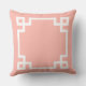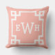 Das stilvolle und moderne Kissendesign mit quadratischem Akzent zeichnet sich durch ein griechisches geometrisches Rahmendesign und ein personalisiertes Monogramm aus. Rosa und weiße Farben. Die Hintergrundfarbe kann geändert werden.