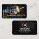 Eine durchsichtige Zuhause mit Spritzer und Graffiti wird demnächst von einer Goldbürste übermalt. An der Unterseite der Karte befindet sich der Firmenname in gelb und die Kontaktdaten. Hinter dem Bild erscheint in der Mitte ein Spritzer. Oben befindet sich ein goldenes "Zuhause-Fächer-Farbstreifen"-Logo, das Sie verwenden können. Darauf folgen der Firmenname, die Kontaktdaten und eine Slogan-Beschriftungsoption, um Ihre Dienste bekannt zu machen. Eine großartige Karte für die Verbesserung von Zuhause und Malerei.